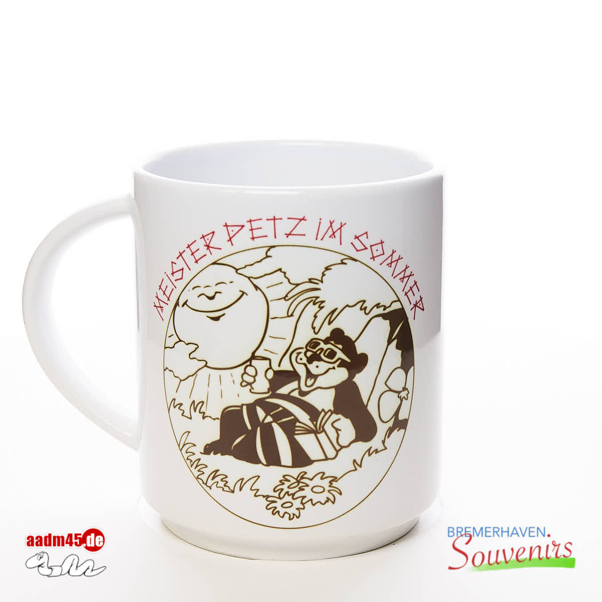 »Meister Petz im Sommer« Illustration Becher – der Bär genießt die Sonne auf einem Liegestuhl. Motiv 2 von 4 Motiven.