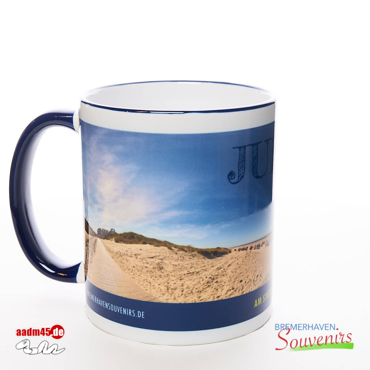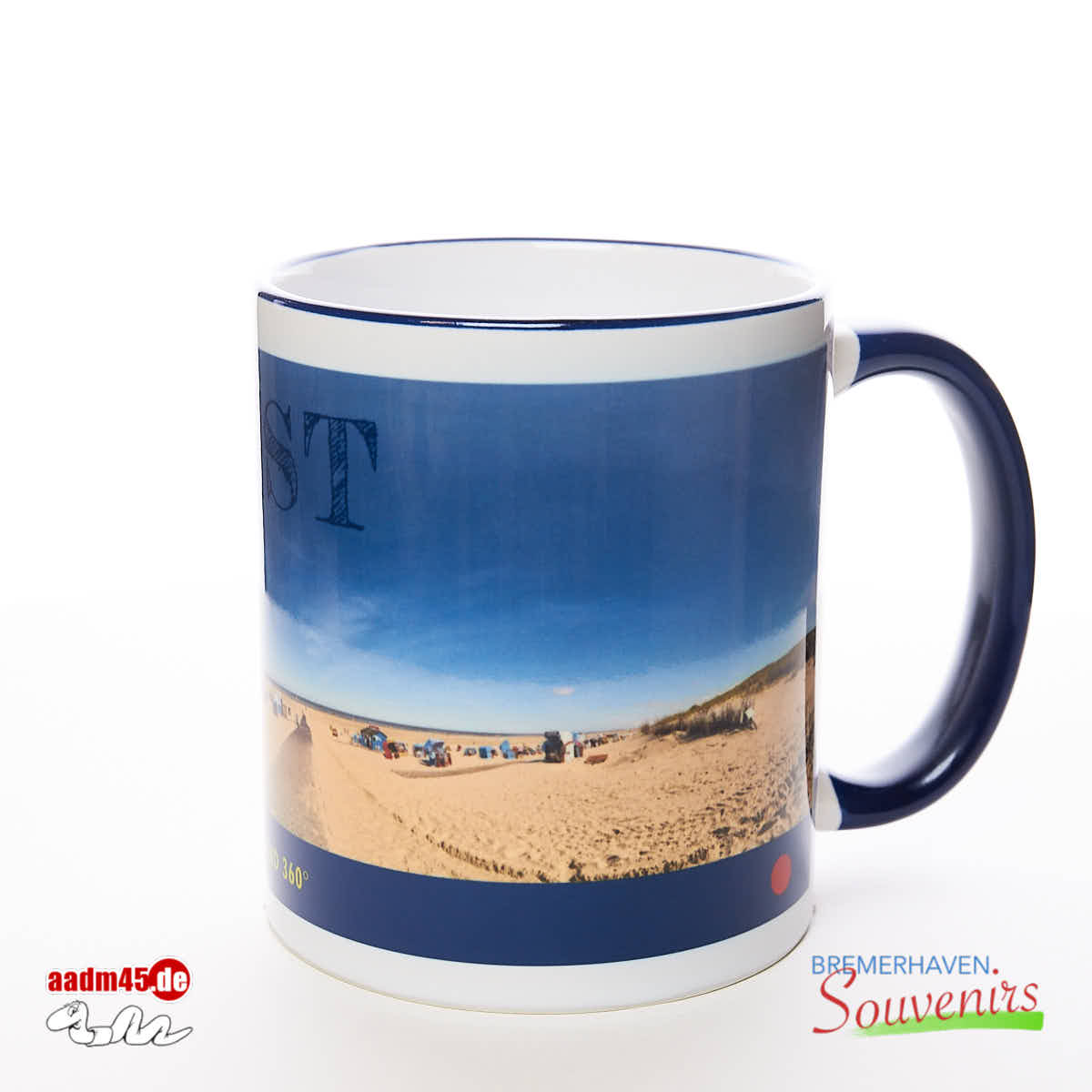 Juist Am Strand 360° Becher Kobaltblau. Adrian Wackernah fotografierte die Szene in 360° rundum und setzte die Einzelbilder digital zu einem Panorama zusammen. Mit Text im blauem Balken.