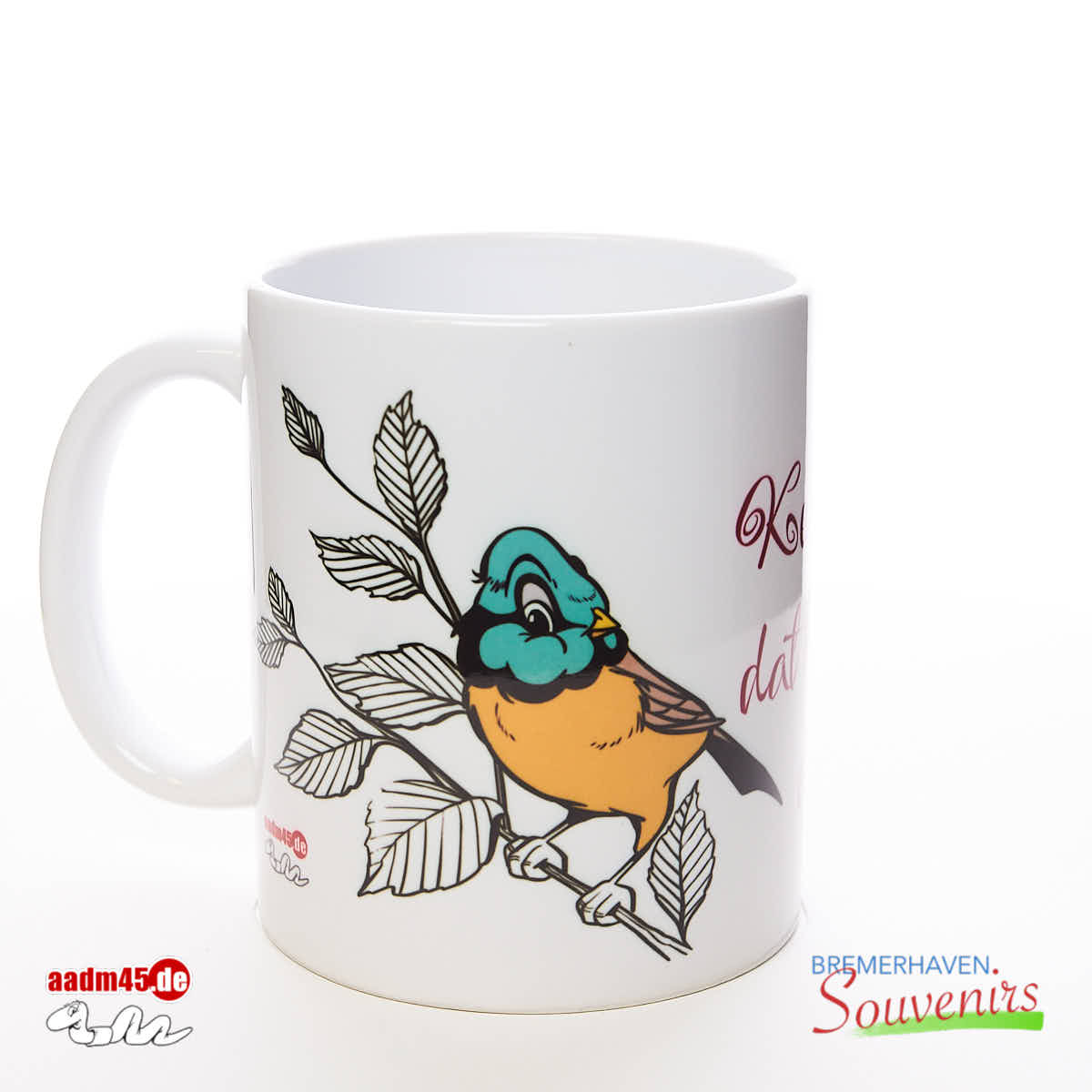 »Keen Narr is so dumm…« Becher © 2025 Adrian Wackernah. Niederdeutsche Weisheit, die besagt das »Keen Narr is so dumm, dat he nich noch een finnt, de em för klook höllt.« (Kein Narr ist so dumm, das er nicht noch jemanden findet, der ihn für klug hält). Mit buntem Vogel auf Zweig und zwei Herzen.
