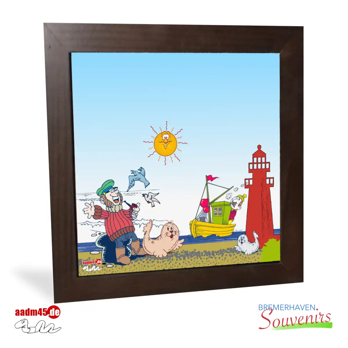 Bremerhaven Souvenirs Design – 15×15 cm Keramikbild im 20×20 cm Holzrahmen. Zum Aufhängen, Aufstellen und Unterstellen.