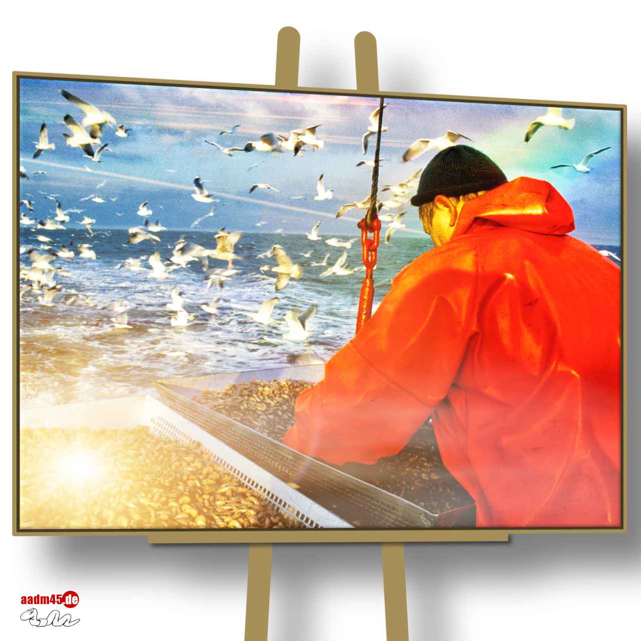 Auf‘m Krabbenkutter ab Dorum © 1995 Ilona Weinhold-Wackernah 100×75 cm – bearbeitet 2024 zur Komposition auf Leinwand auf Keilrahmen gerahmt im Schattenfugenrahmen
