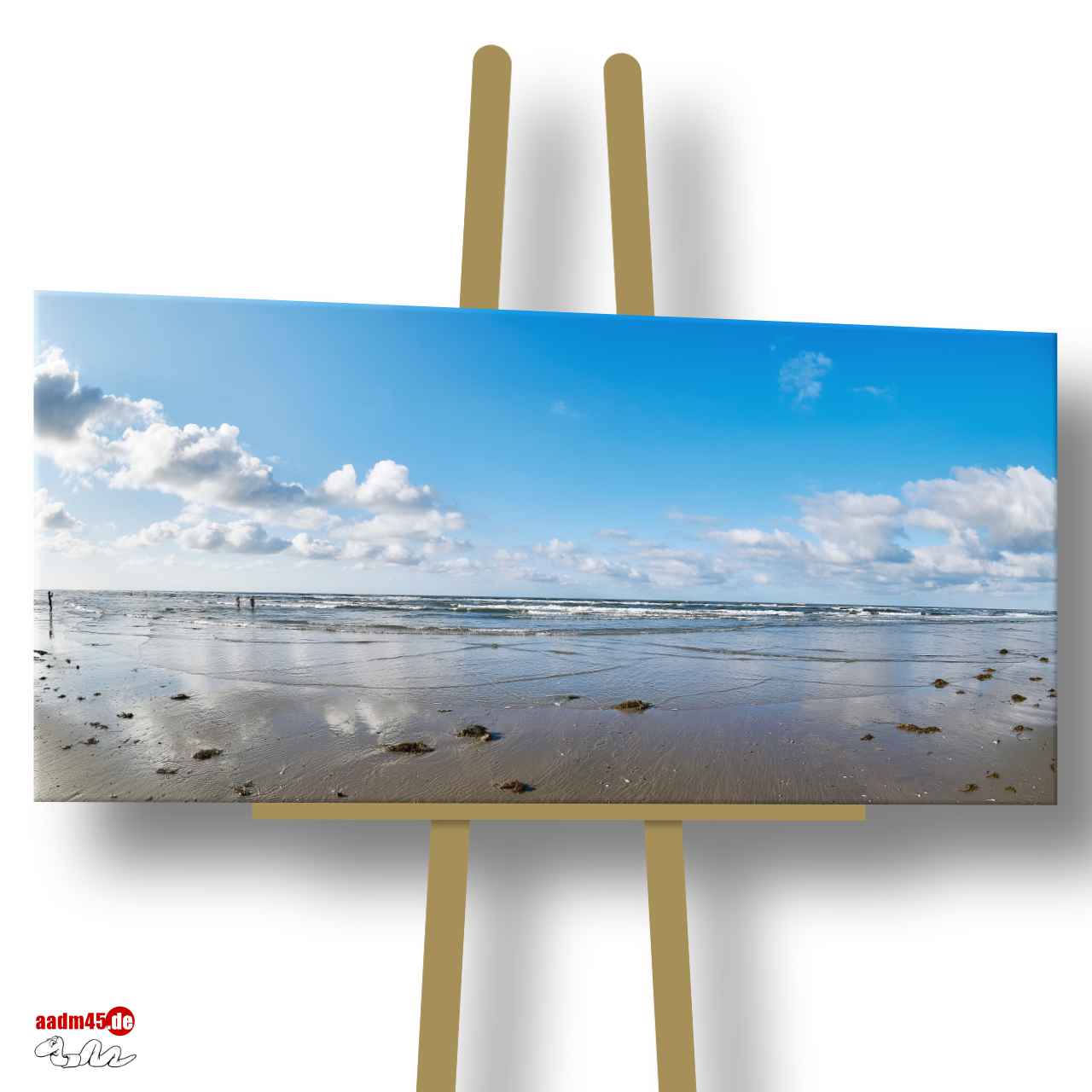 Juist Am Strand 120×60 cm Canvas, die Fotografie ist von © 2015 Adrian J.-G. Wackernah. Meereswellen der Nordsee laufen bis in den Sand aus, der mit Wolken behangene blaue Himmel spiegelt sich im Wasser am Strand.